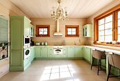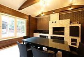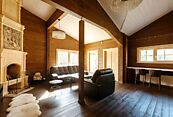 Первый этаж: кухня-гостиная, санузел, кабинет, спальня, кладовая, гараж, блок для персонала, котельная.