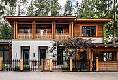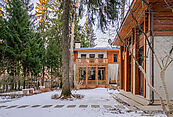 Архитектура дома — авторский проект Федора Арзаманова и бюро «Акант», воплощающий эстетику современного стиля. Высокие потолки и панорамные окна наполняют пространство светом, создавая ощущение легкости и простора. В отделке использованы редкие и ценные материалы: мрамор, порфир, красное африканское дерево анегри с глубоким янтарным оттенком. Обстановка выдержана в гармоничном сочетании современного и винтажного дизайна: мебель Gervasoni, кухня Bulthaup, дизайнерские светильники.