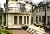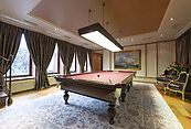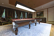 Первый этаж: прихожая, холл, гардеробная, гостевой санузел, гостиная с камином и выходом на участок, кухня, столовая с выходом на террасу, большая летняя терраса, комната отдыха, бильярдная, сауна, душевая, санузел, большая летняя терраса на заднем дворе, гараж;